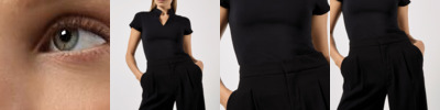 - Feminine V-neck 1 x 1 ribbed collar in self fabric