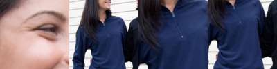 - Wide crew neck collar with 1 x 1 ribbed piping and double top stitching in self fabric